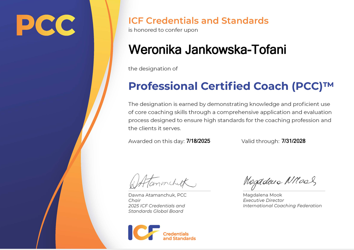 I am a certified Master Coach with the International Coaching Federation (PCC), hold a Business Coaching Diploma from PwC, am a graduate of The Life Coach School and a Certified Emotional Intelligence Coach from Symbiosis Coaching. I use techniques learned from the positive psychology, cognitive therapy and neuroscience and I am happy to conduct coaching group and individual sessions in English, Polish, Italian, and French.